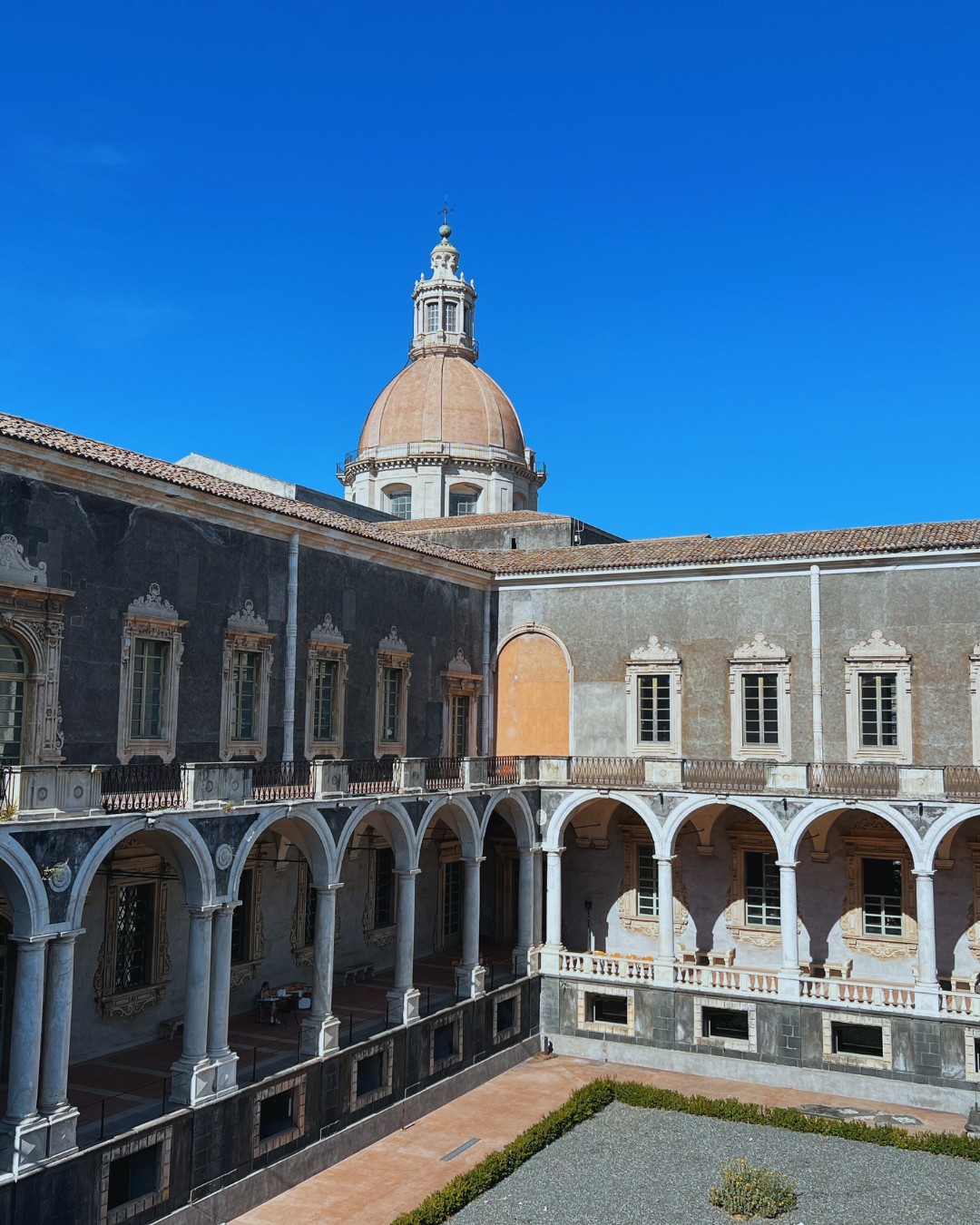 Il Monastero di San Nicolò l’Arena è vasto come un quartiere claustrale. Chiostri seriali, scale che attraversano colate antiche, biblioteche che profumano di carta e cera. Dopo il 1693 la fabbrica si amplia e ingloba la lava, diventando una grammatica di resilienza in barocco. La città intera, con i suoi isolati regolari e le quinte scenografiche, è parte della stessa risposta: una ricostruzione esemplare nel quadro delle Città Tardo Barocche del Val di Noto.