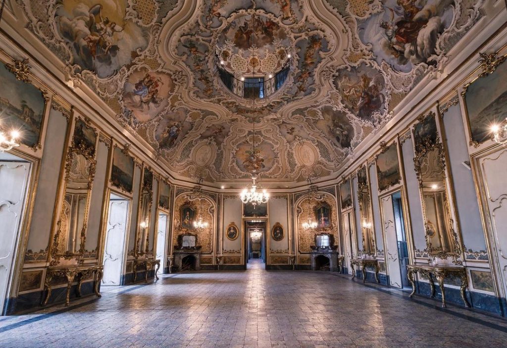 Varcando la soglia, ci si immerge in una sequenza di saloni affrescati, stucchi dorati e terrazze che si aprono verso l’orizzonte. La celebre sala da ballo, con la loggia riservata ai musicisti, racconta un’epoca in cui musica, danza e conversazione erano strumenti fondamentali di rappresentanza sociale. Qui il rococò non è mero stile, ma linguaggio di potere, seduzione e mondanità.