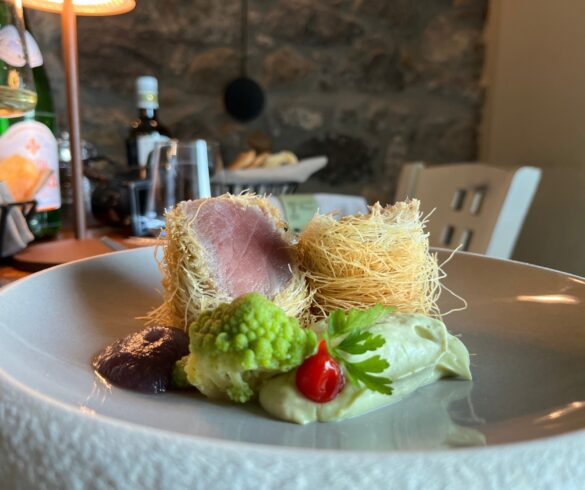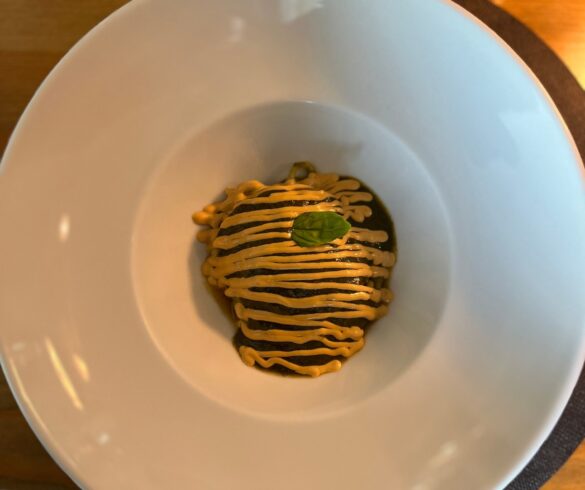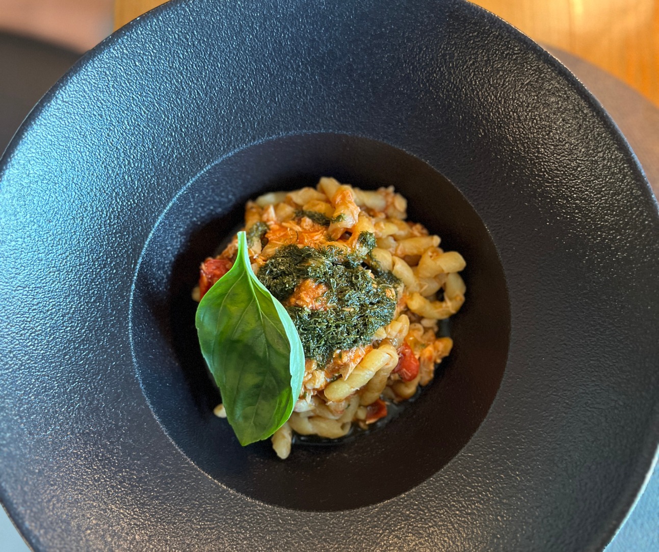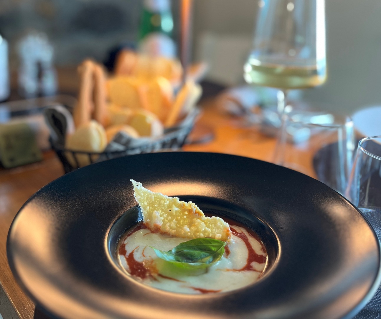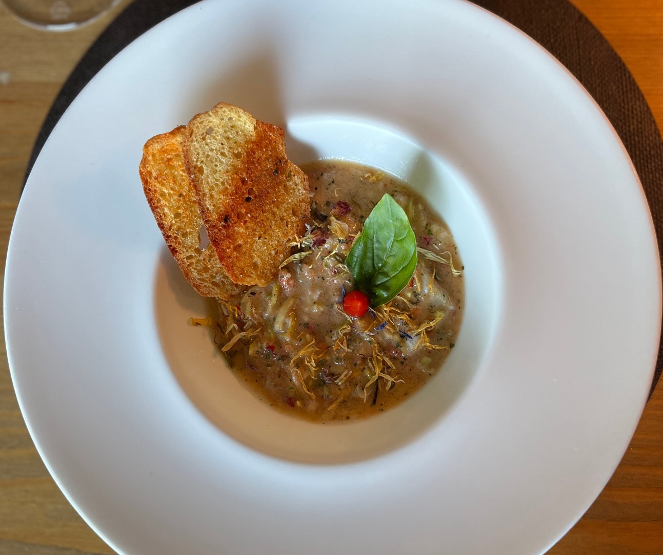 Il primo piatto che arriva in tavola è una zuppetta di cannellini e pescato del giorno. Una fondina ampia, bianca, e dentro una crema vellutata che profuma di terra e di mare. I cannellini sono ridotti in purea con una delicatezza quasi carezzevole, mentre il pescato – sfaldato, dolce, impeccabile – rilascia l’impronta iodica del Tirreno. Sopra, fiori essiccati e un basilico posato come un sigillo. I crostini croccanti affondano lentamente nella crema. È un piatto che scalda e conforta, un inizio morbido e sensoriale, che racconta la cucina dei pescatori in una veste elegante.