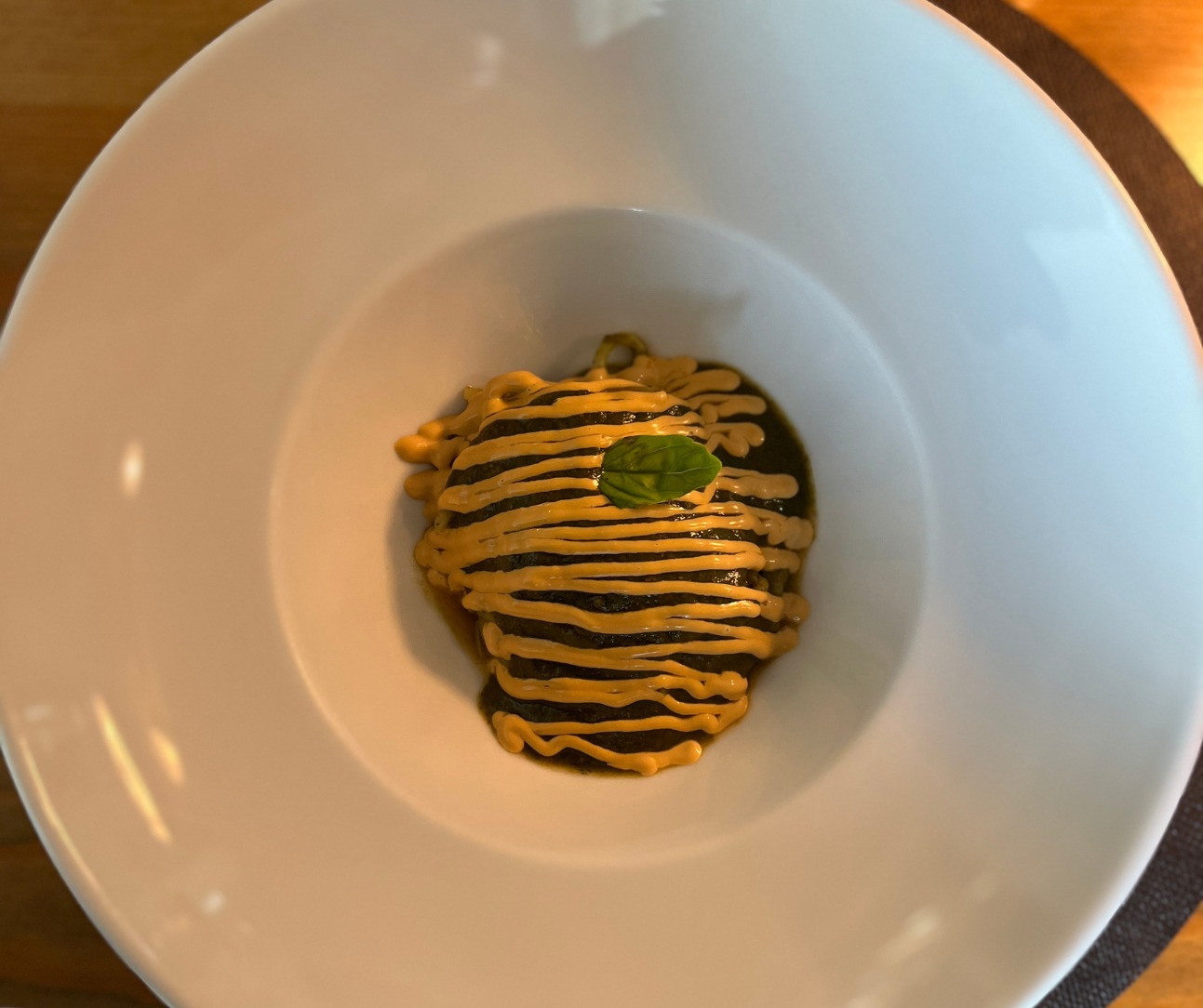 Arriva poi la mousse di parmigiana di melanzane, servita in un piatto nero che accende i contrasti. Alla base, una salsa di pomodoro dolce-acida; sopra, la mousse di melanzane è leggera come una promessa, affumicata quel tanto che basta per evocare il profumo delle grigliate estive. La cialda di parmigiano aggiunge croccantezza. È un boccone che sa di infanzia, di domeniche lente, di mani che cucinano senza fretta. Un antipasto che è più un ricordo che una portata.