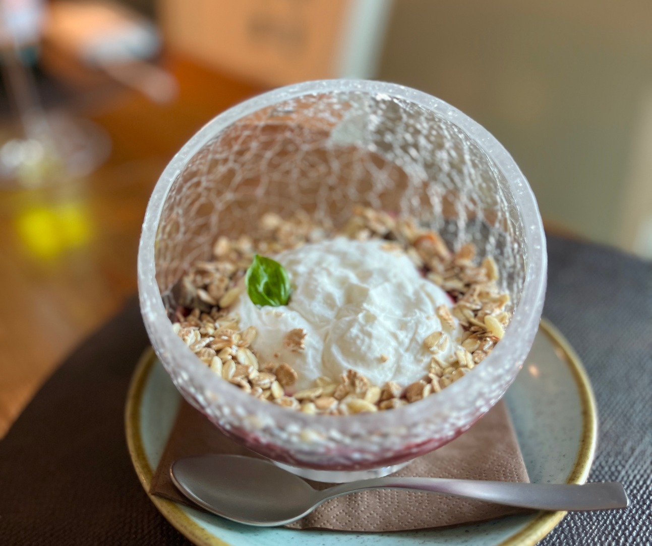 Prima dei dessert, una pausa fresca: lo yogurt montato con coulis di frutti rossi e crumble, servito in una ciotola che sembra un piccolo vaso di vetro lavorato. Lo yogurt è una nuvola, il coulis è un’esplosione di acidità e colore, il crumble porta ritmo. Una coccola perfetta.