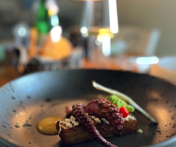 Il percorso prosegue con il polpo a bassa temperatura, scottato con maestria. I tentacoli sono lucidi, quasi laccati, croccanti fuori e burrosi dentro. A completare, una crema verde vellutata, cavolfiori colorati, romanesco, una goccia di gel agrumato. È un piatto armonioso, equilibrato, che valorizza il polpo senza travestirlo.