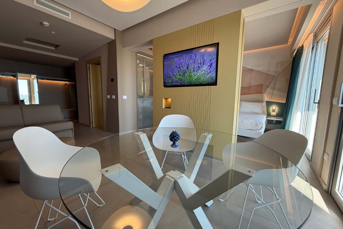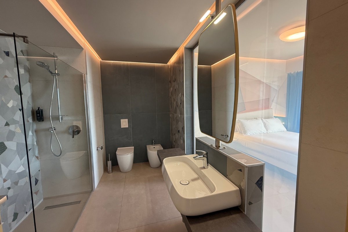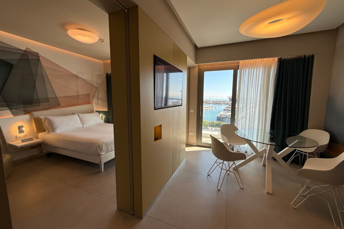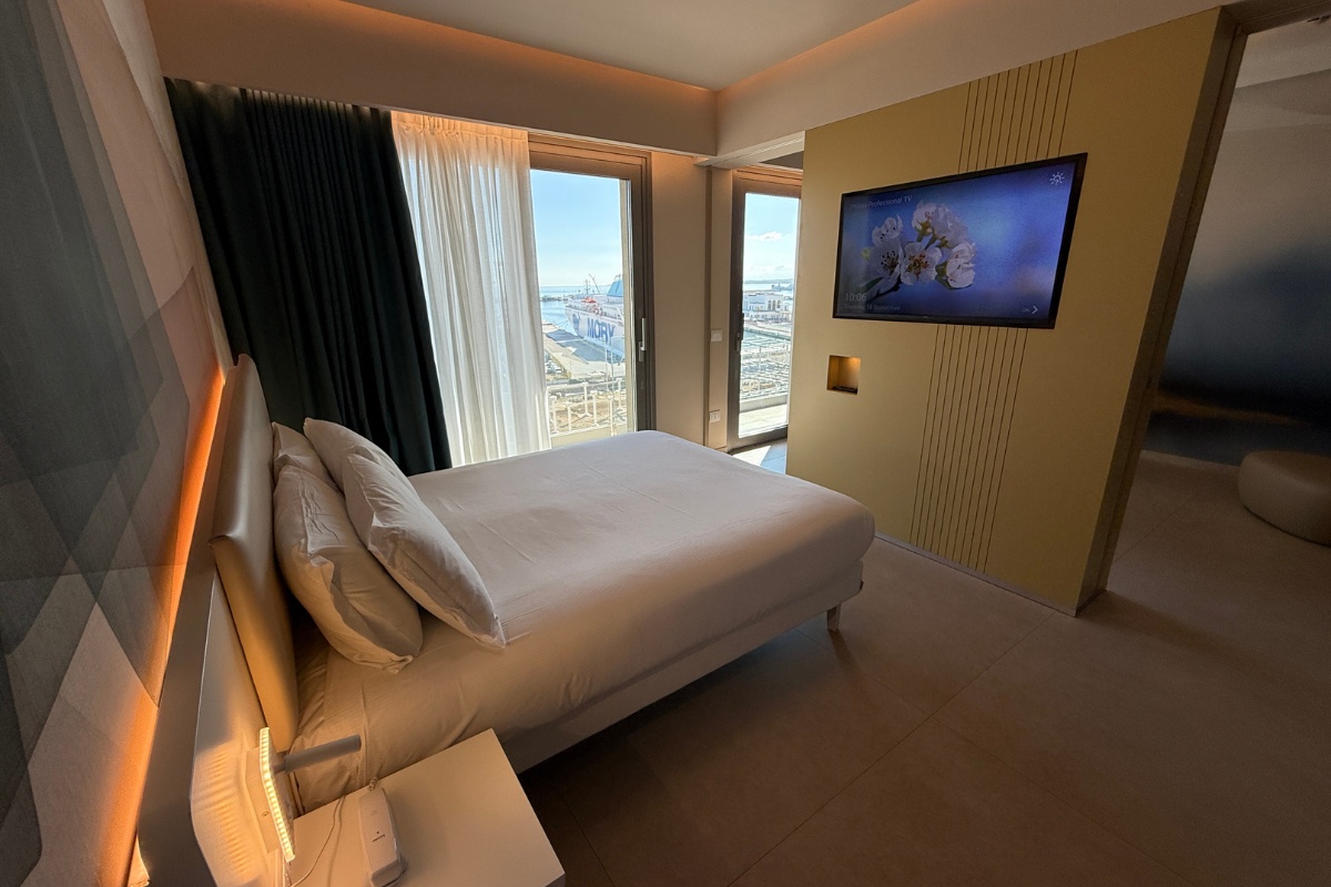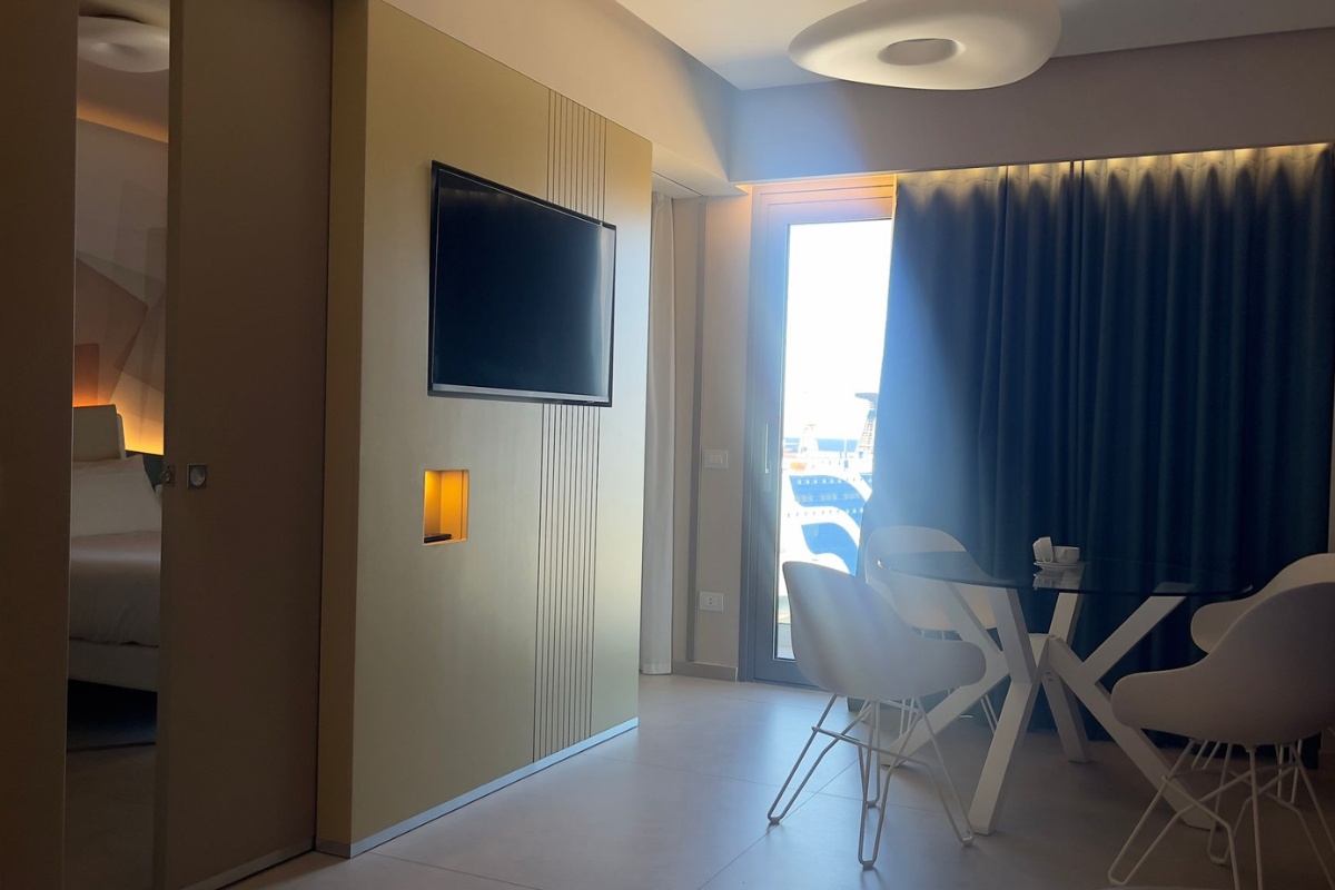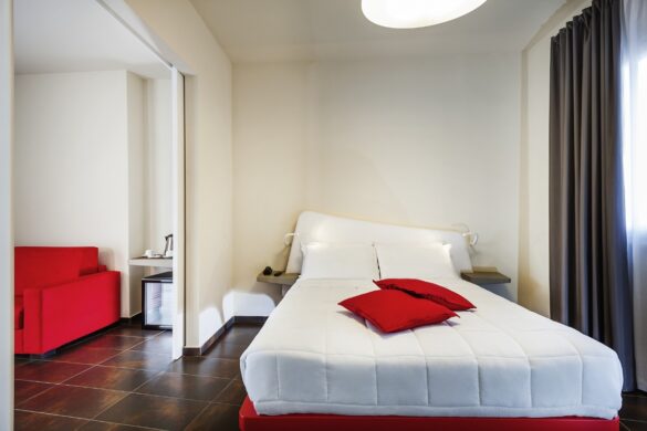 Le due Suite rappresentano l’apice della comodità per chi viaggia in famiglia o ha semplicemente bisogno di respirare. Qui non si tratta solo di dormire, ma di abitare. L’eleganza moderna si fonde con metrature generose, creando un abbraccio di luce e stile. La vera differenza la fa il salottino separato con divano letto: non è un semplice arredo, ma diventa uno spazio di condivisione, il luogo dove ridere e raccontarsi la giornata appena trascorsa. È il rifugio perfetto per trasformare un soggiorno in hotel in un ricordo familiare prezioso.